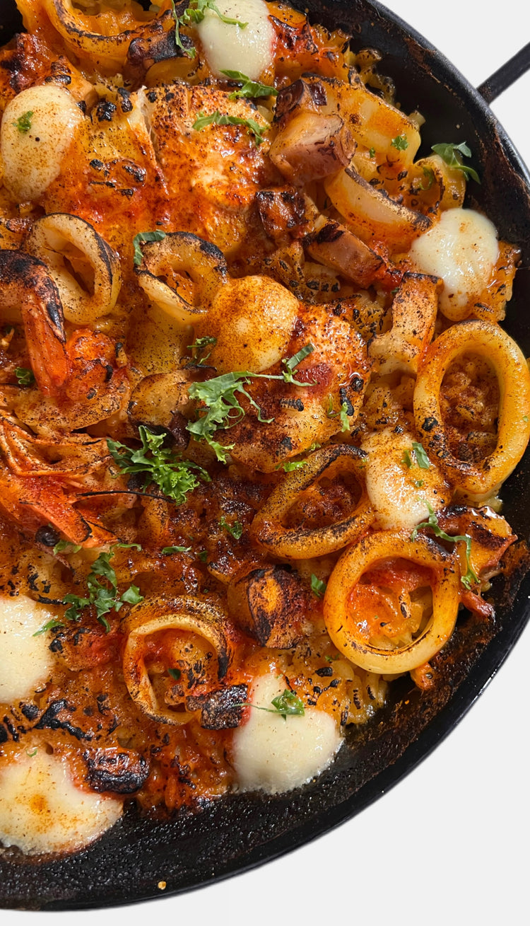 Paella Frutos del Mar [ Bacalao (Cod) + Shrimp + Calamar + Octopus] (Keep the Paella Pan)